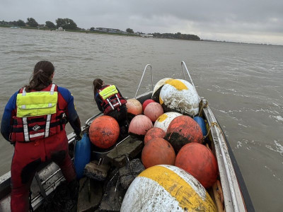 Einholen der Badebetrezungstonnen am Dangaster Badestrand.