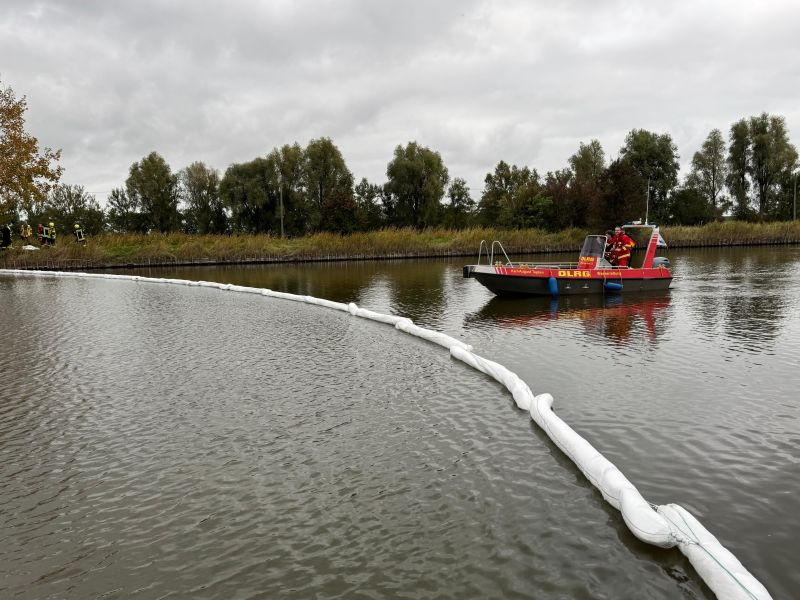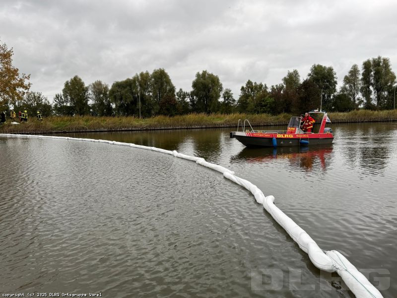 Am Samstagnachmittag, den 11.10.2025, wurden wir um 15:55 Uhr mit dem Stichwort „H_Öl_Wasser“ alarmiert. Nach Eintreffen an der Schleuse gegen 16:20 Uhr verschafften wir uns gemeinsam mit der Freiwilligen Feuerwehr Varel einen Überblick über die Lage. Ursache der Alarmierung war ein Ölaustritt, wo die Gefahr bestand, dass dies in den Bereich der Wilhelm-Kammann-Schleuse und somit in die angrenzende Nordsee gelangt.